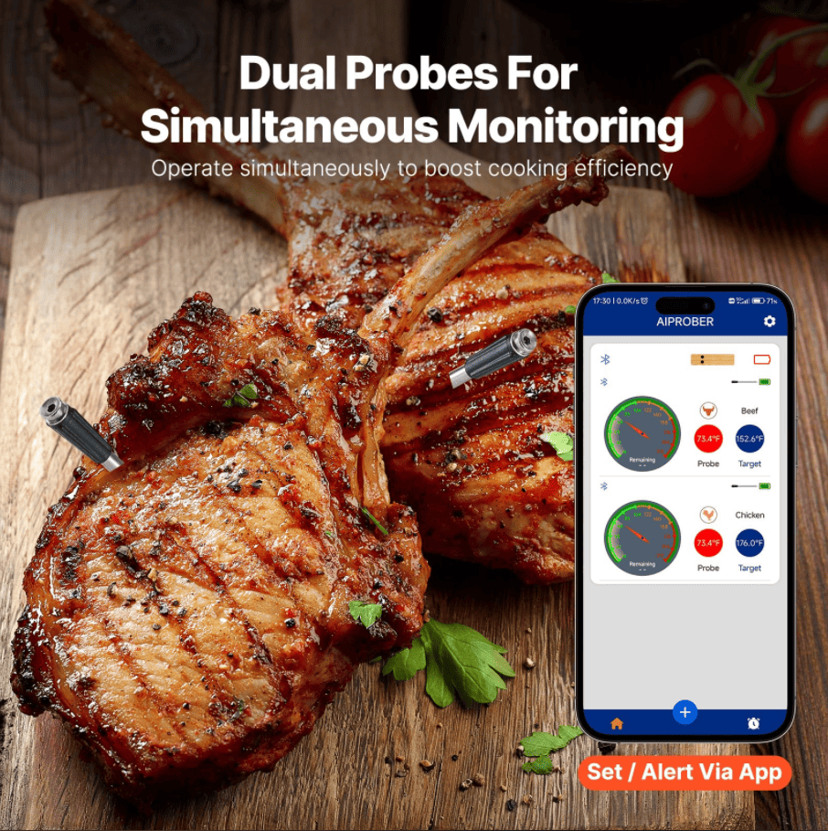 SKU:  PSJX168A barbecue meat thermometer SUS304 food grade Bluetooth 5.2 transmission distance 700FT battery life 24h 1000mah response time 1 second probe temperature sound warning source factory quality assurance good quality and low price retro style